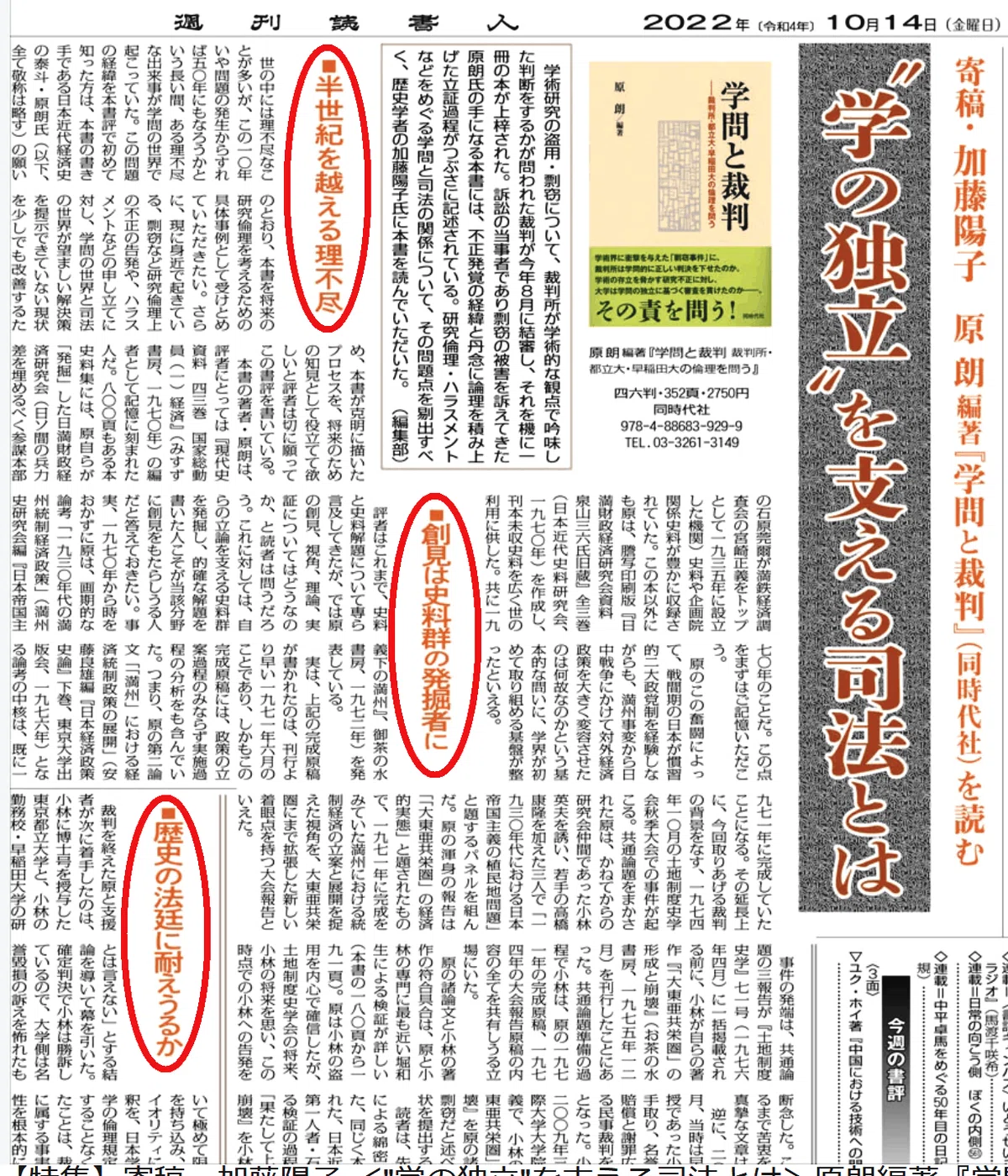 原 朗のこの本『創作か 盗作か 「大東亜共栄圏」論をめぐって』2020年2月のなかでも触れられているように,裁判(官)が学問の内容について,その研究領域の業績・成果に関した現状把握をよく理解できないまま詮議した結果,しかも今回の場合,「盗作」された原が「盗作した小林英夫」に提訴されて,一審・二審ともに被告の原が敗訴までするという,学問の世界における視座からみれば “驚天動地の顛末” が現象させられていた。