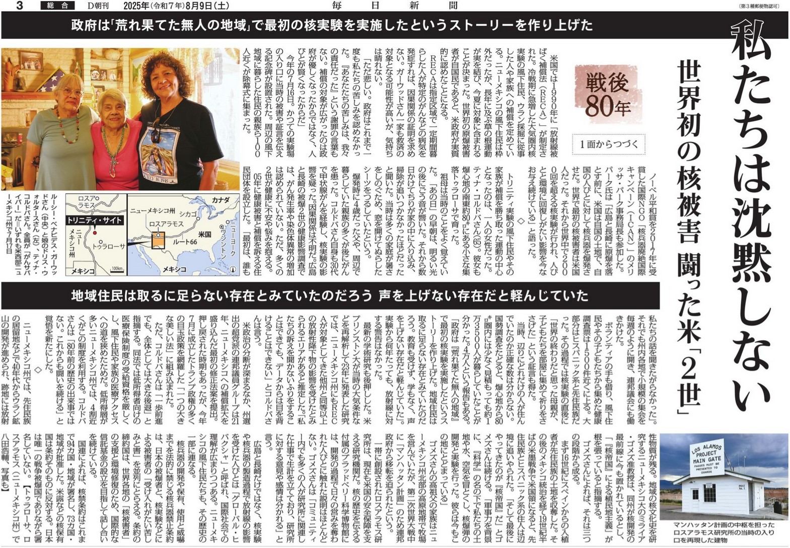 この「私たちは沈黙しない 世界最初の核被害 闘った米『2世』」『毎日新聞』2025年8月9日朝刊3面の記事がとりあげた「核」の問題と,日本で8月の6日と9日にちなんで毎年,記憶に呼び戻される「核」の問題とのあいだに,根源的な相違性はない。むしろ,本来よりまったく同質の問題であった。